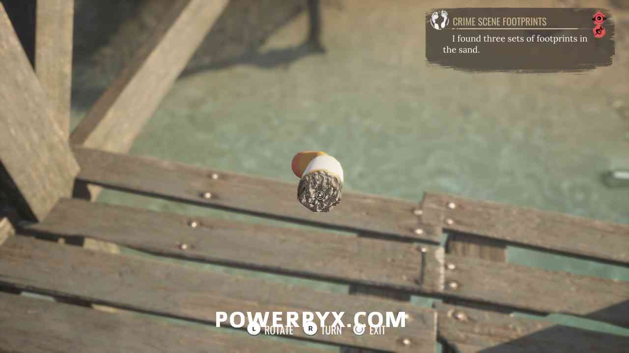 6) Stay in concentration mode and follow the tracks to the end of the jetty. There you will find a cigarette. Inspect the start and end of the cigarette to reveal its flavor and lipstick on it.