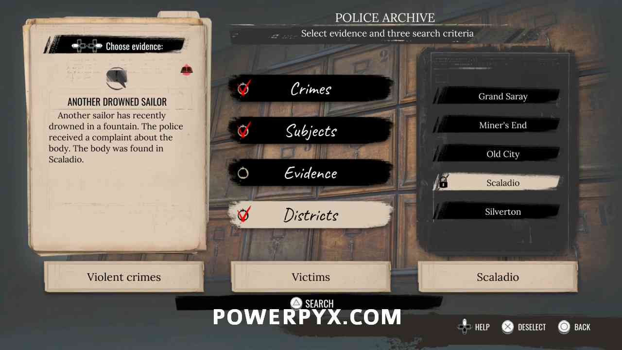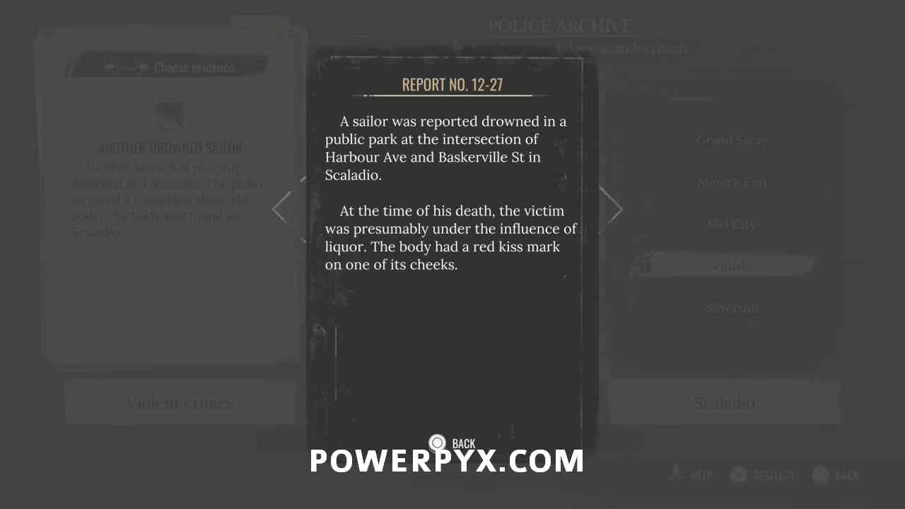 8) Pin the objective “Another Drowned Sailor” and fast travel to the Cordona Police Station. Use the Police Archive and filter for Crimes = Violent / Subjects = Victims / Districts = Scaladio (only works while objective is pinned). This will give you the police report and reveals the “Public Park” where the corpse was found.