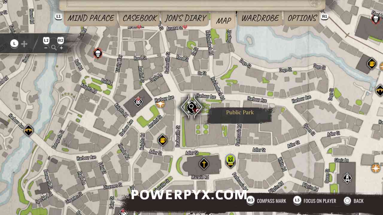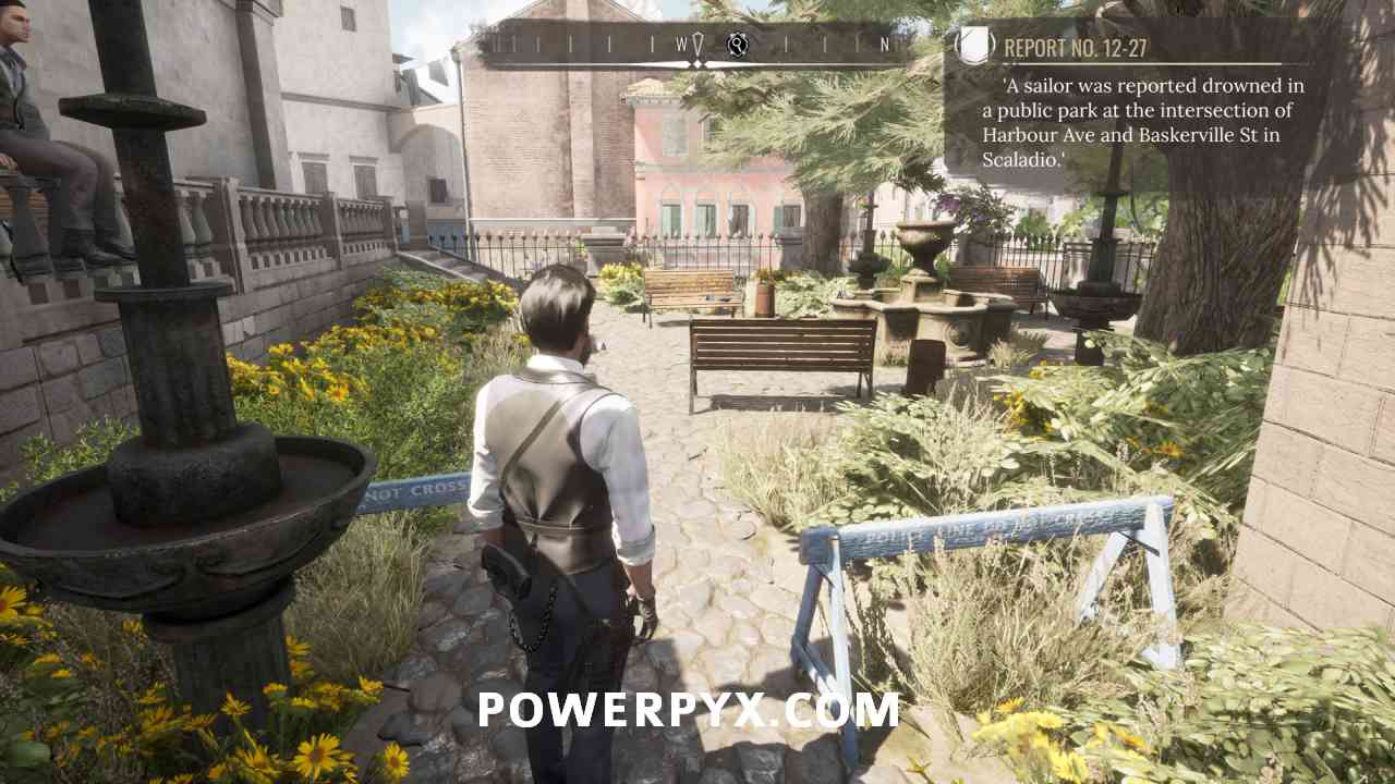 9) Pin objective “Report No. 12-27” and head to the Public Park, to the immediate east of the Police Station (just a few steps away). It will be marked on your map. In the center of the park enter the crime scene.