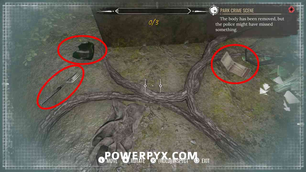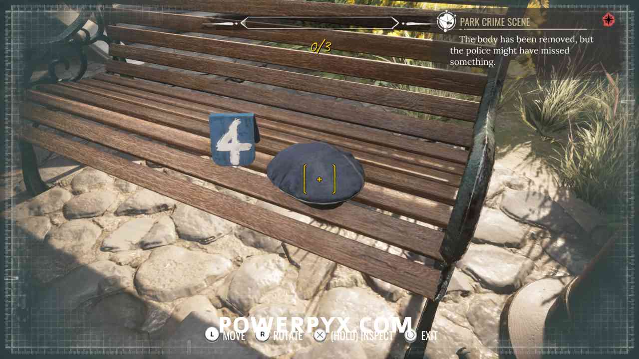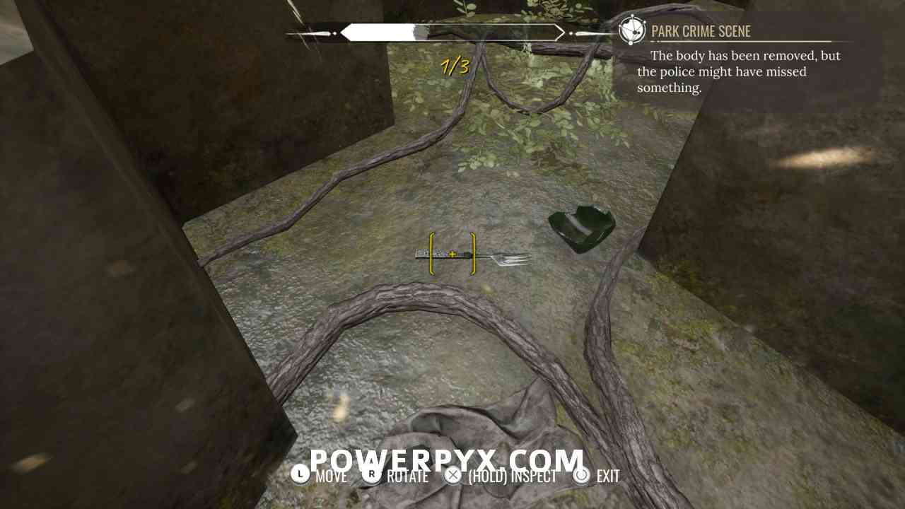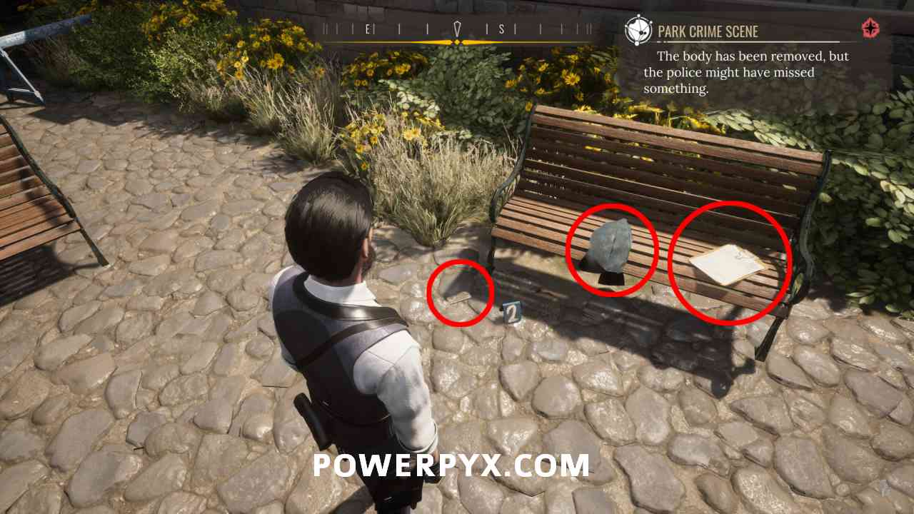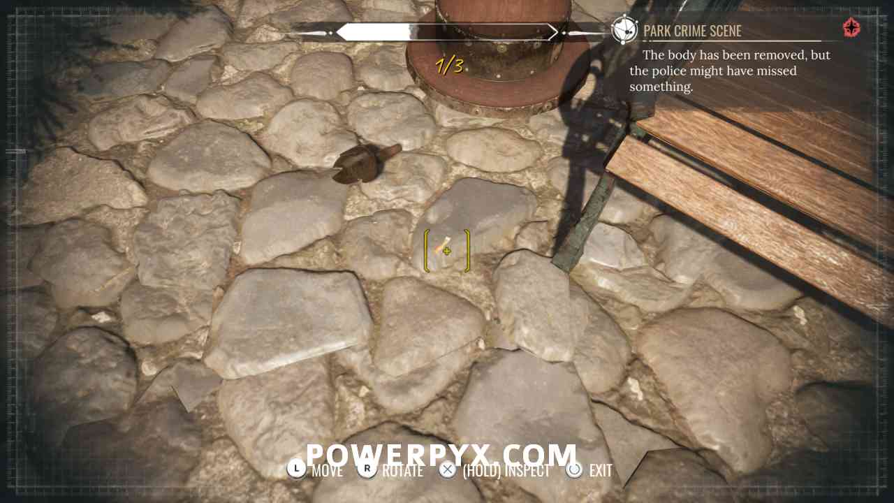 10) Pin the “Park Crime Scene” objective. Investigate the well (“1” marker).