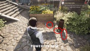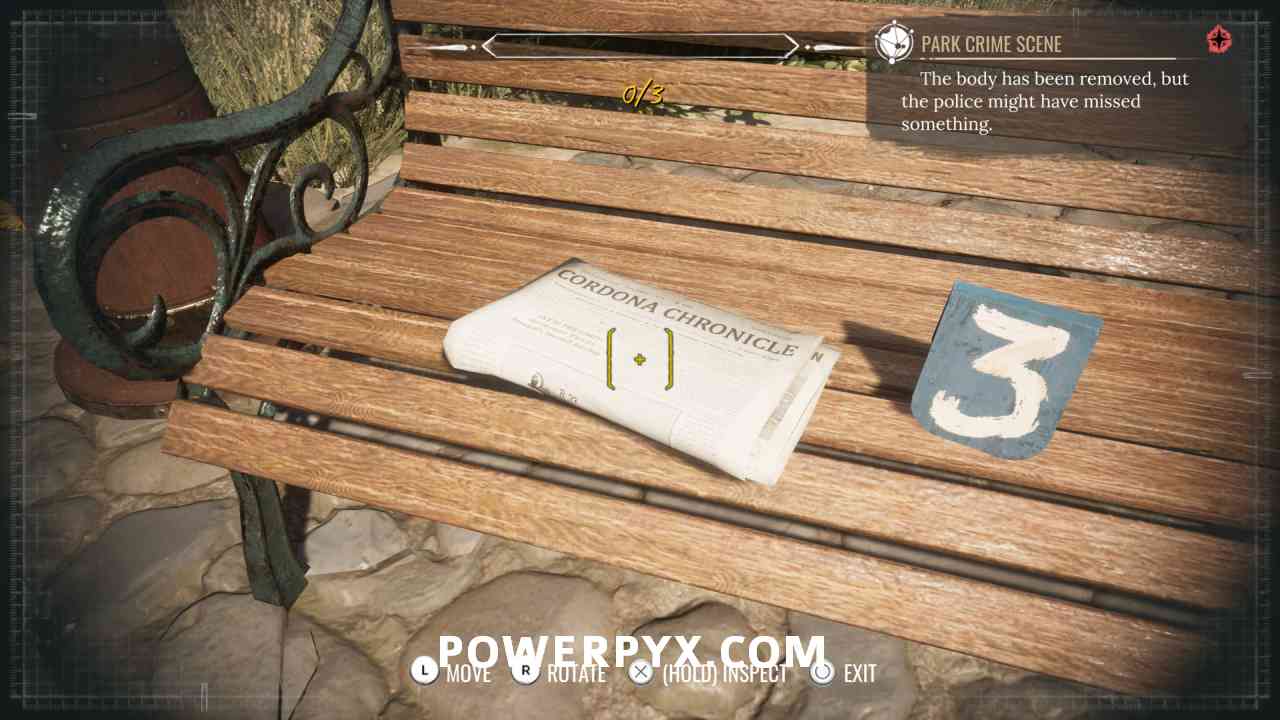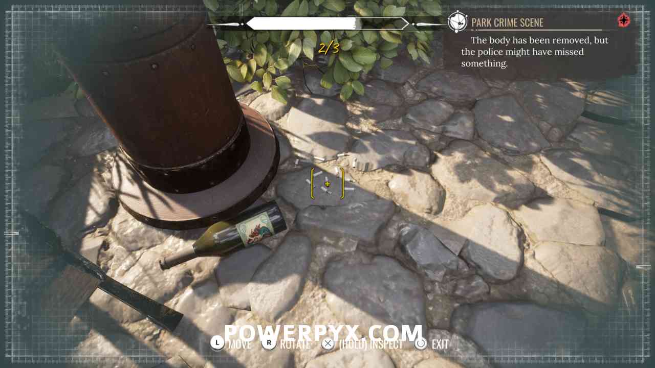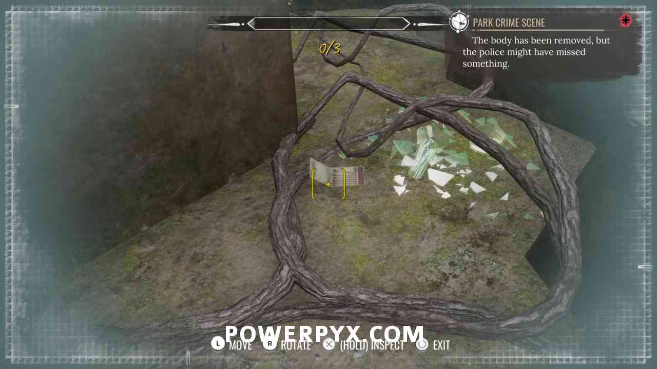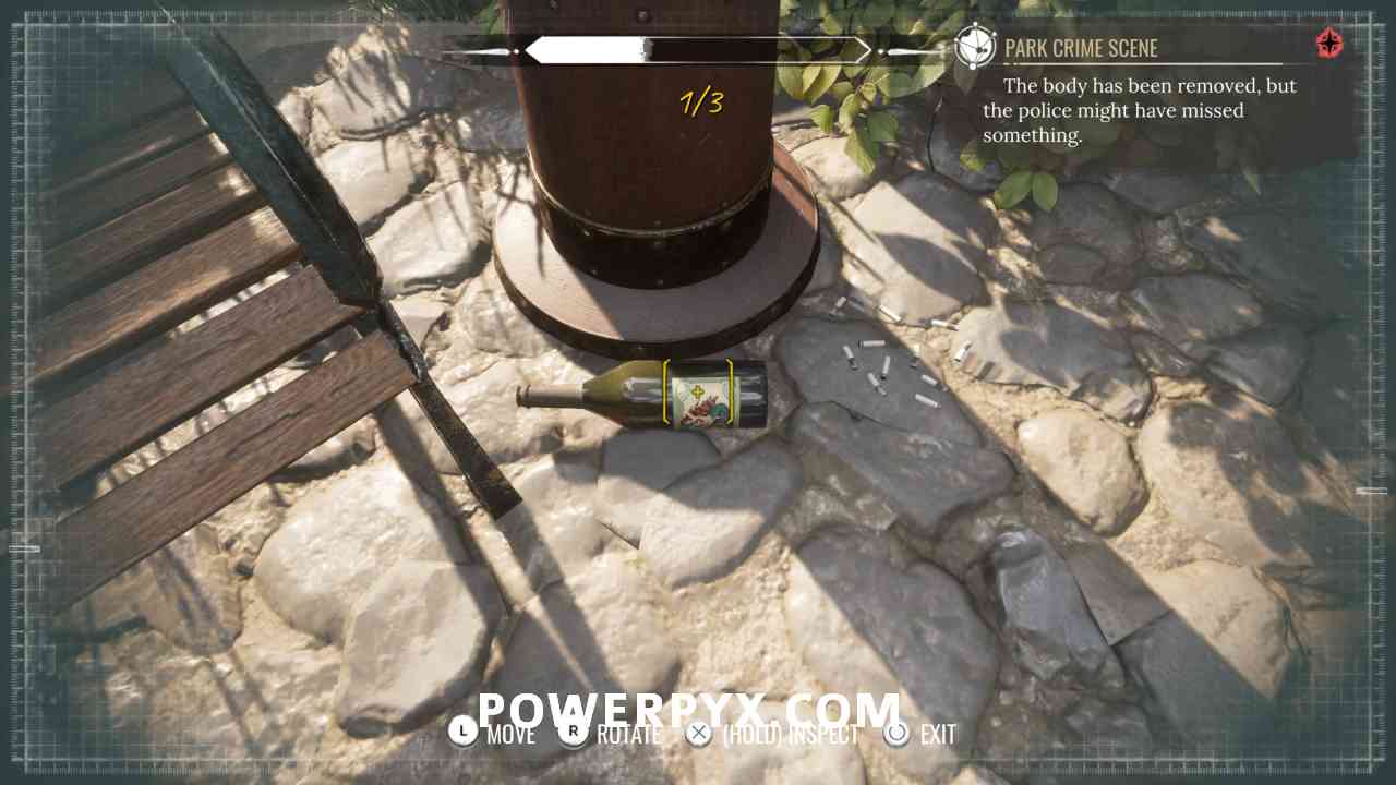10) Pin the “Park Crime Scene” objective. Investigate the well (“1” marker).