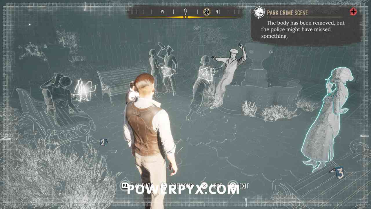 14) Now interact with the white orb in front of the well. The correct reconstruction solution is shown below. Going by the order of the police marker numbers: 1 = Woman pushes man into well, 2 = woman kisses man on bench, 3 = woman smoking cigarette, 4 = woman claps and man drinks from bottle. After placing everyone, validate with