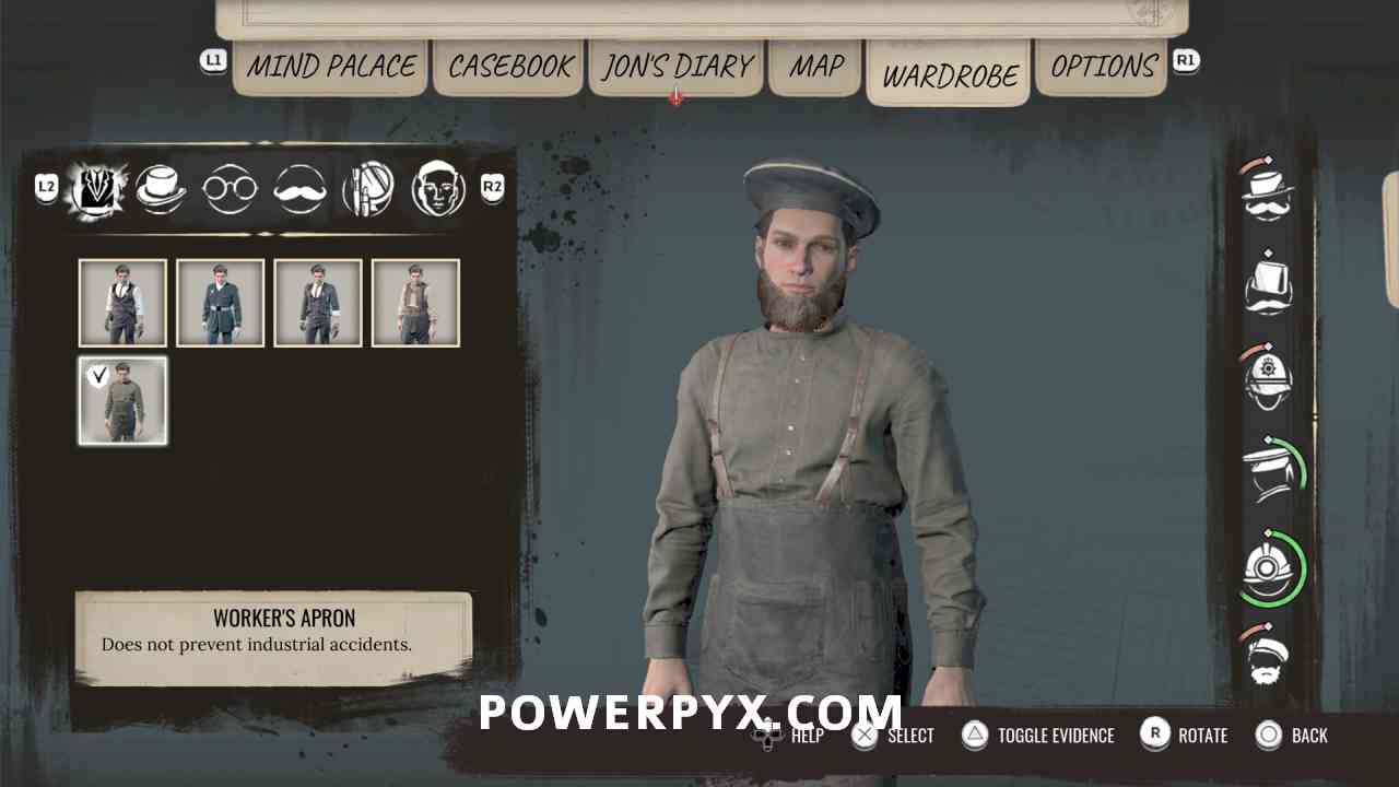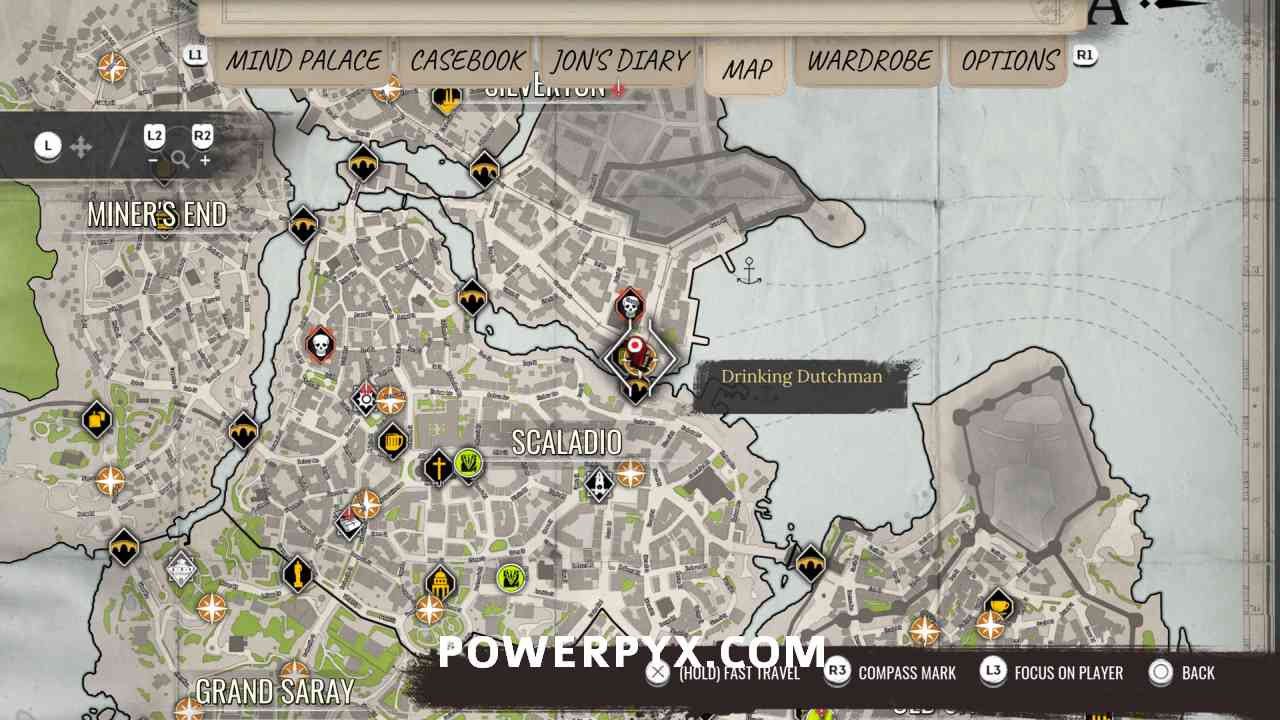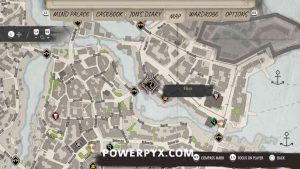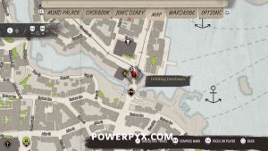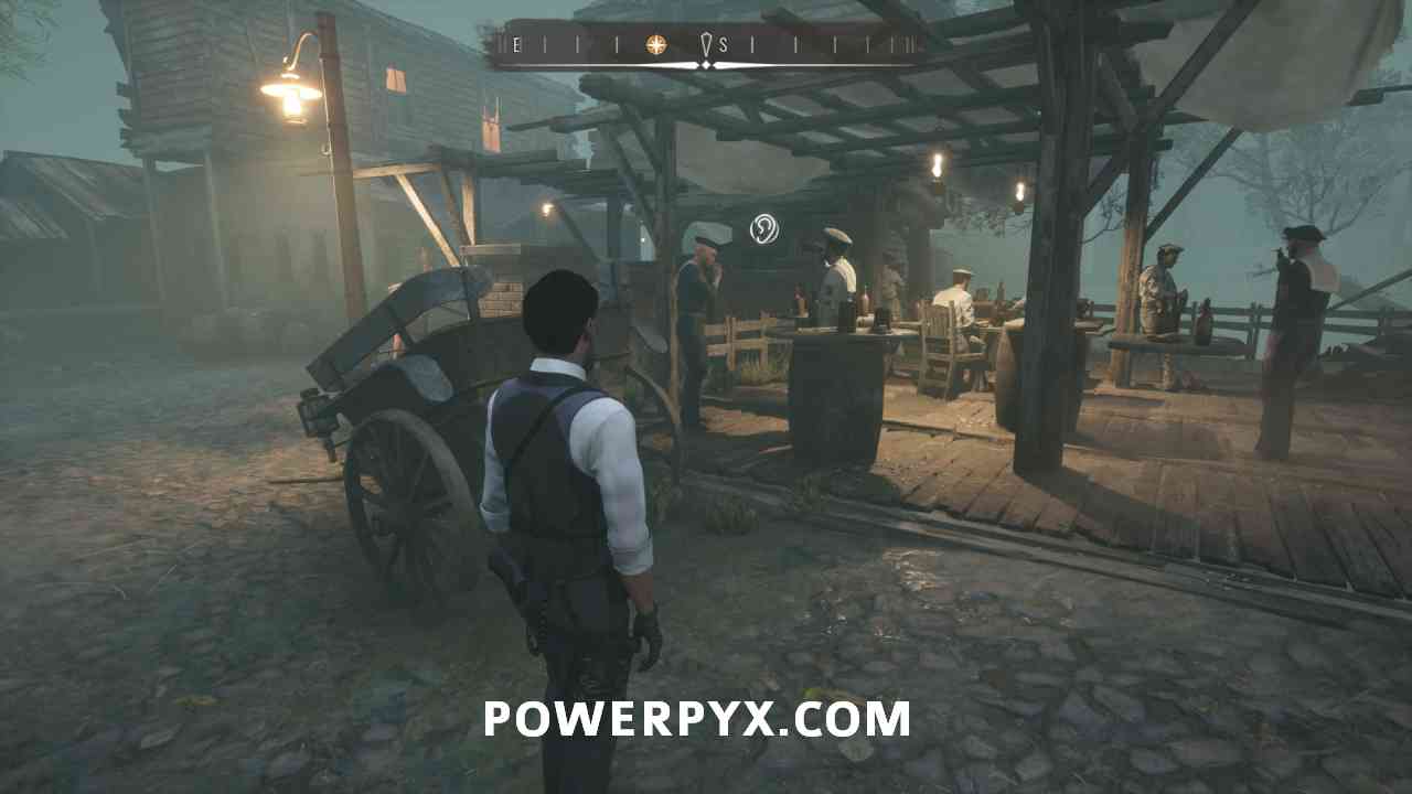 16) Track the objective “Wet Matchbox”, which you got from inspecting the matchbox in the well. It wants you to go to the Drinking Dutchman pub, the place where the quest started (1st image below). Fast travel there, head down the stairs and enter the pub (2nd image below), talk to the bartender. You need to wear a cheap outfit that sailors are sympathetic towards, such as the Worker’s Apron or Sailor Uniform, also put on the Sailor Cap and a full beard. Don’t wear suits, he won’t talk to you if you look too fancy. Clothes can be bought or rented from clothing traders marked on the map. The 3rd image below shows an outfit that works, the 4th image shows the barkeeper to talk to. Exhaust all dialogues with the barkeeper.