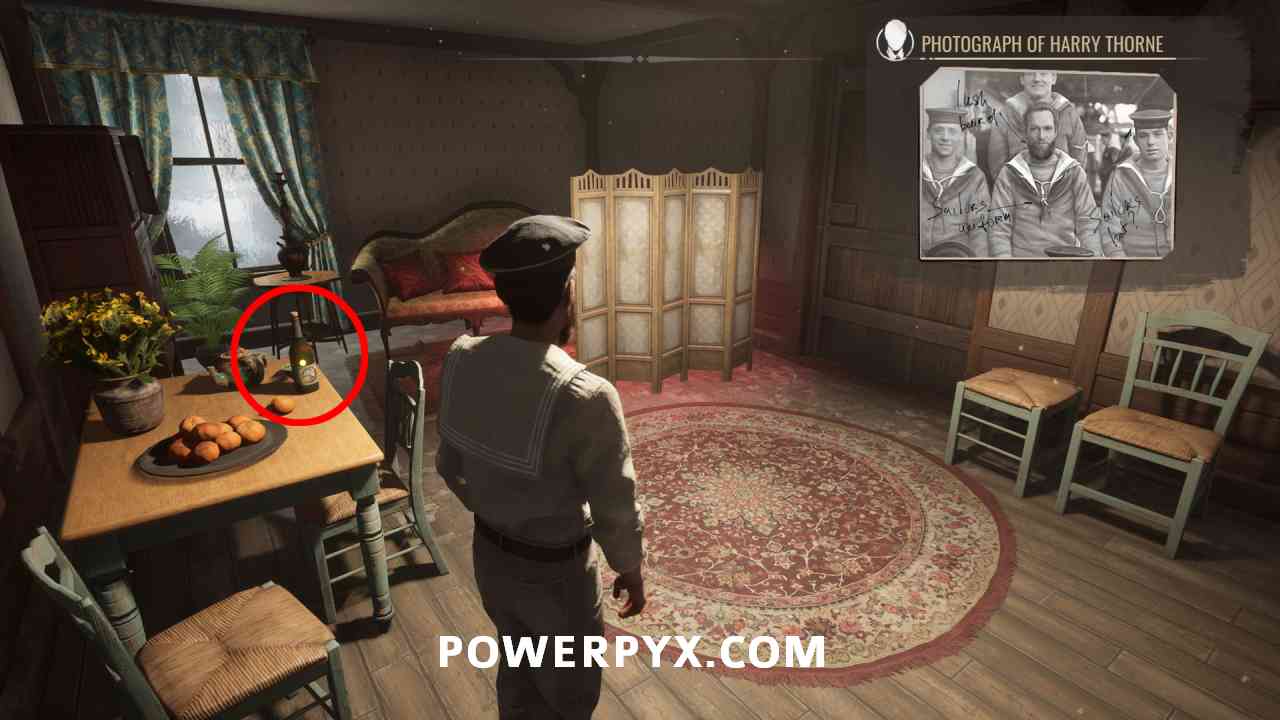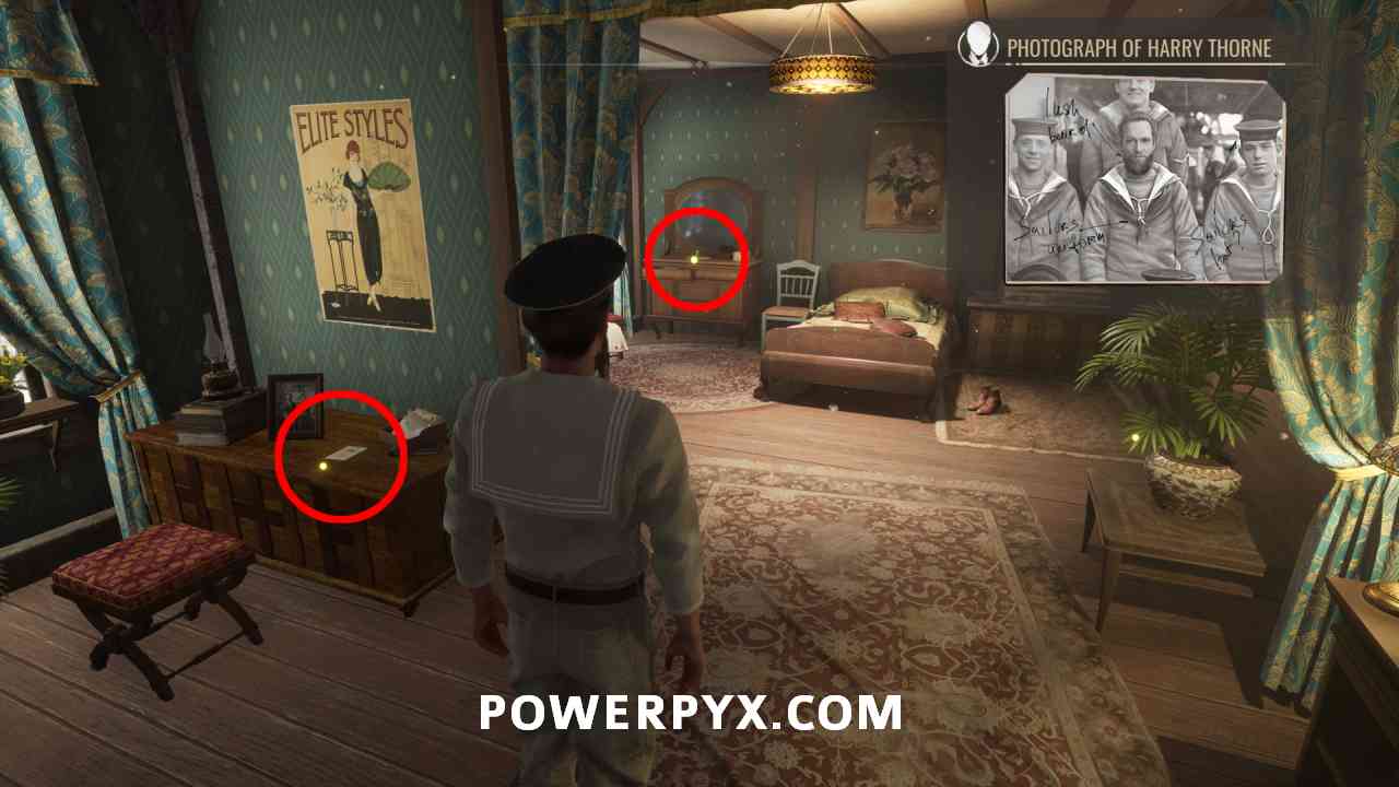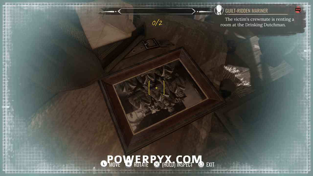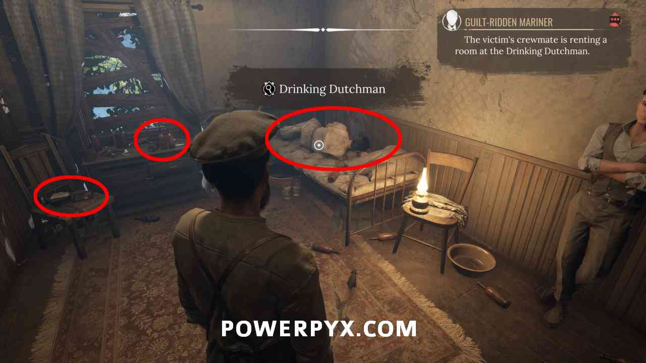 18) Go back inside Drinking Dutchman, head upstairs, enter the last room on the right. There’s a sleeping sailor inside and some evidence. On the chair, inspect with the photograph (view front and back), and the letter (rotate to see kiss mark). You can also inspect the bottles and the sleeping sailor, but he’s out cold and not in the capacity to talk to anyone.