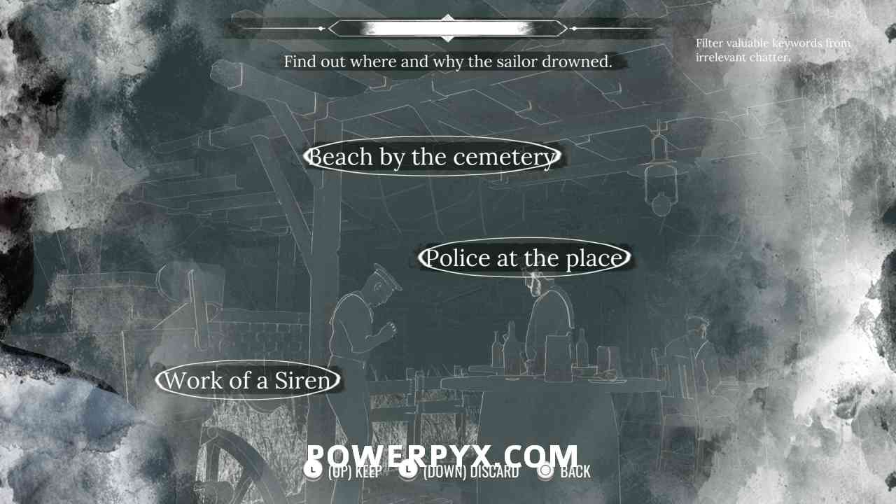 This is only available after Main Case “A Gilded Cage“. You must overhear the two sailors at the outside bar, next to the Drinking Dutchman fast travel point. The correct terms to filter out are: Beach by the cemetery, Police at the place, Work of a Siren.
