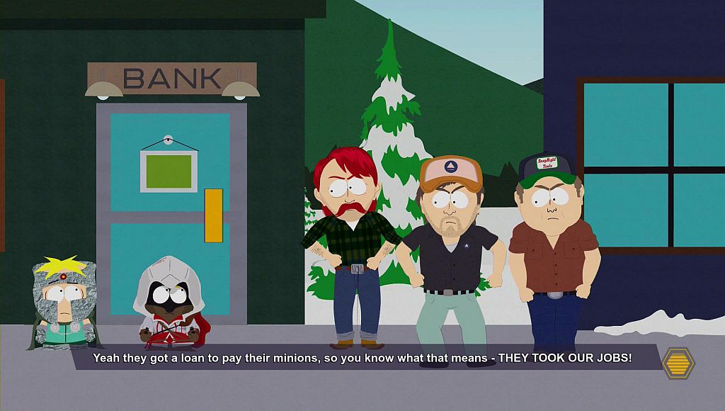 Butters will let you know that he has some financial problems now. He is no longer able to pay his Mexican minions and wants you to join him on his trip to South Park Bank.