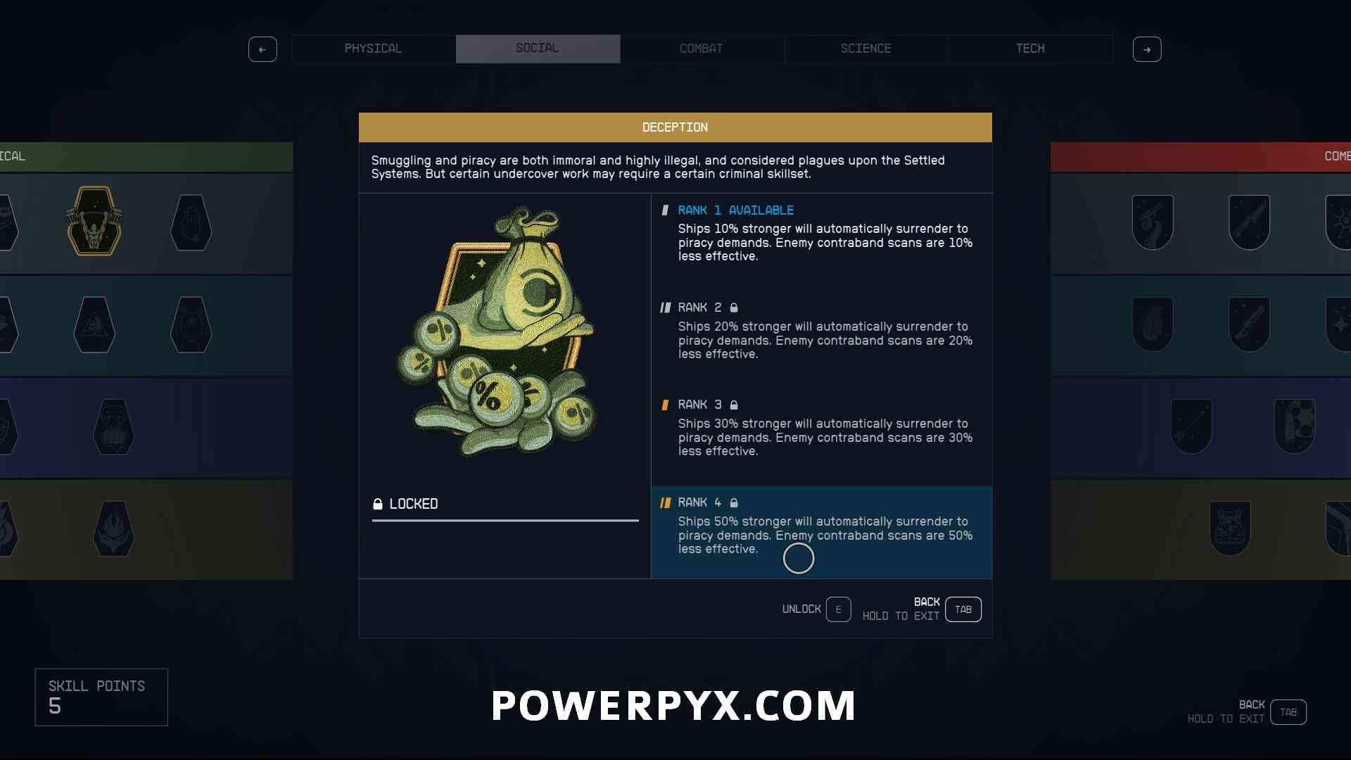 - Buy and upgrade the social skill “Deception“. At Rank 4 it gives a 50% chance to avoid detection when smuggling Contraband. Combined with the best Scan Jammer that also gives 50% chance to avoid detection and a Shielded Cargo Hold, you will effectively have 100% chance to avoid detection.