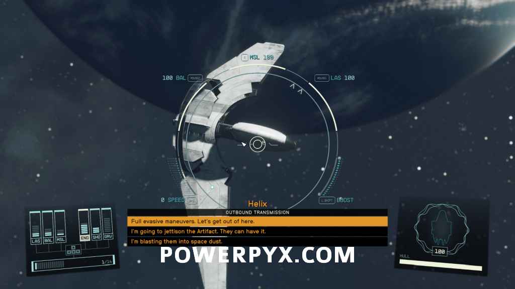 This mission starts immediately after you take off from Neon. You’re stopped by a strange ship, who demands that you give them the Artifact you just obtained. Your choice is either to agree to give it to them, or decline and quickly grav-jump away. You can opt to attack their ship, but it’s quite high level relative to others you’ve encountered so far in the story, so you’re likely to be immediately destroyed if you try that.