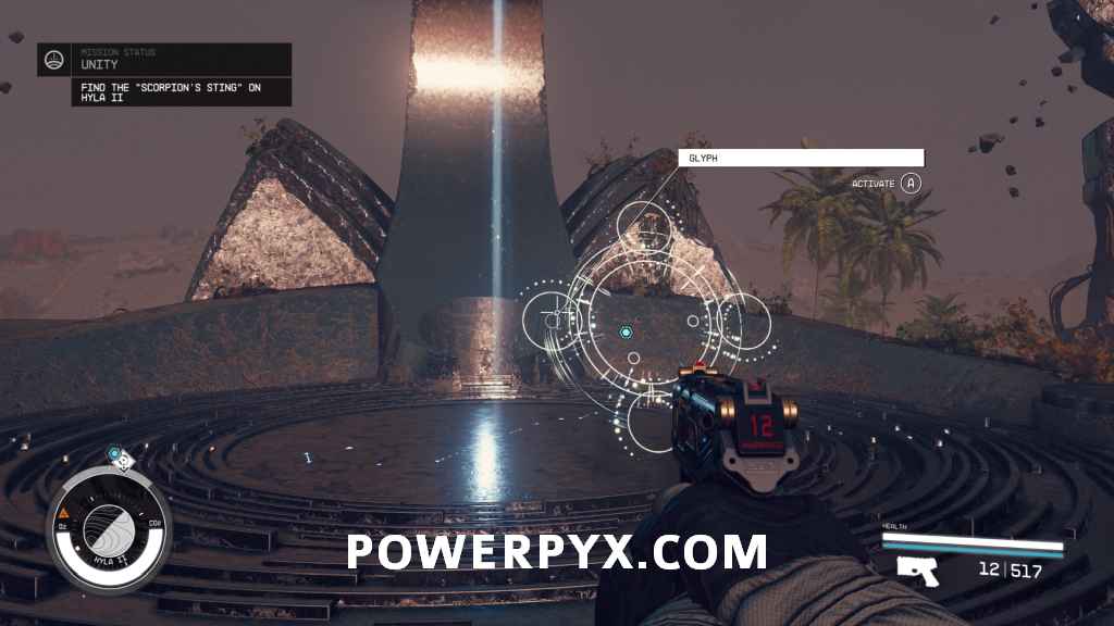 When you land make your way towards the objective where the large statues are located. Deal with all the hostile fauna on the way, then go to the center where a glowing glyph is.