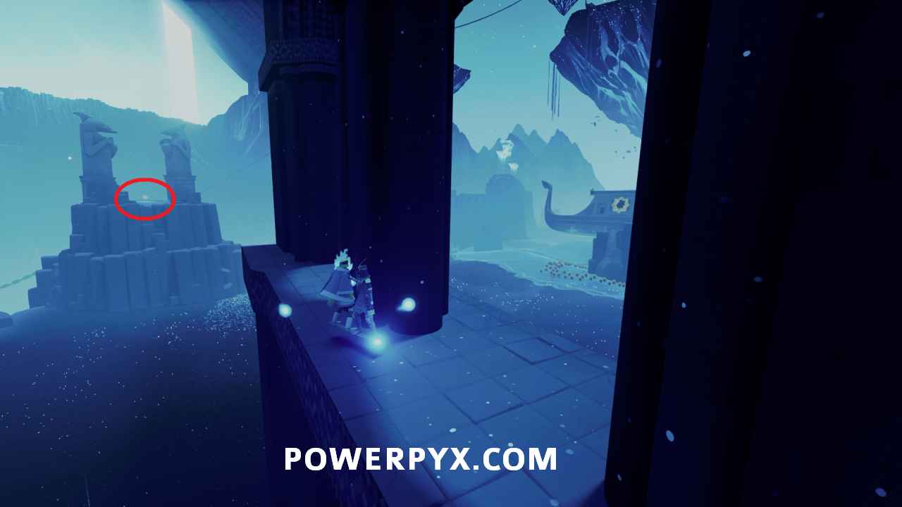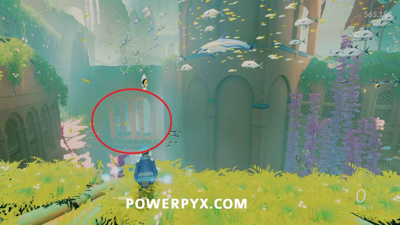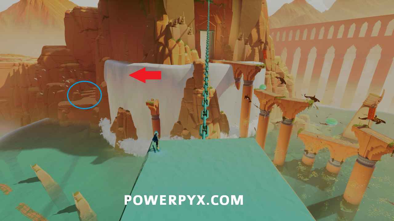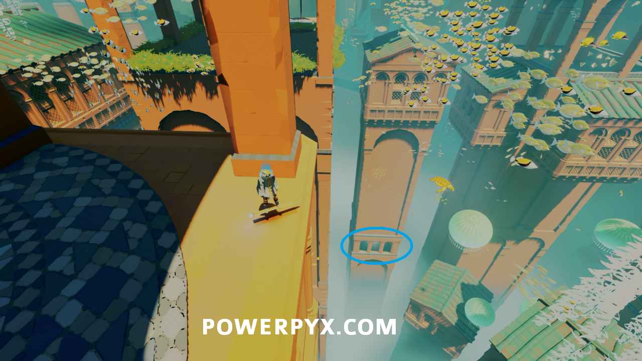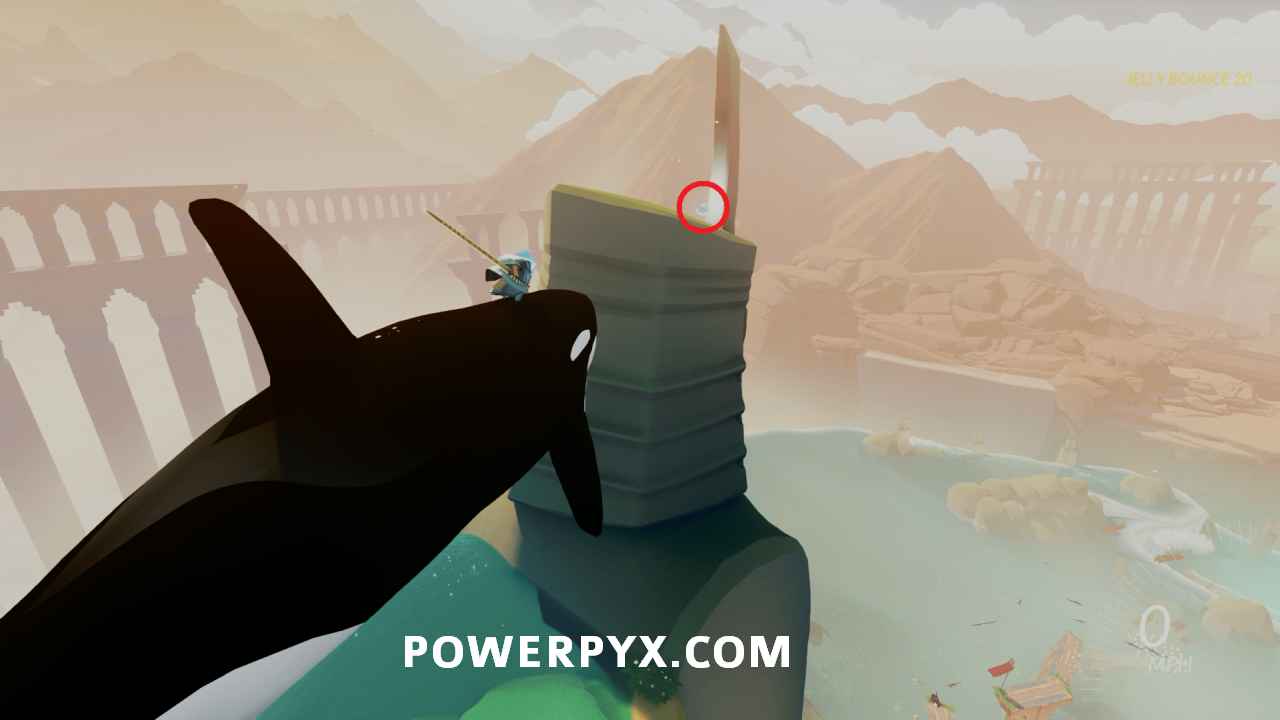 Secret Shell #4 – After activating the main water point that activates the left chain, go to the top of the building above the vendor and look at the statue on the left where you can spot a shell on top. To reach it you need to ride one of the Orca that are swimming around when it goes near the statue, then jump on top to reach the shell.