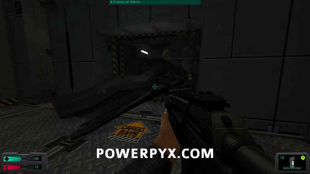 On the floor in the hallway to Cargo Bays, next to a turret.