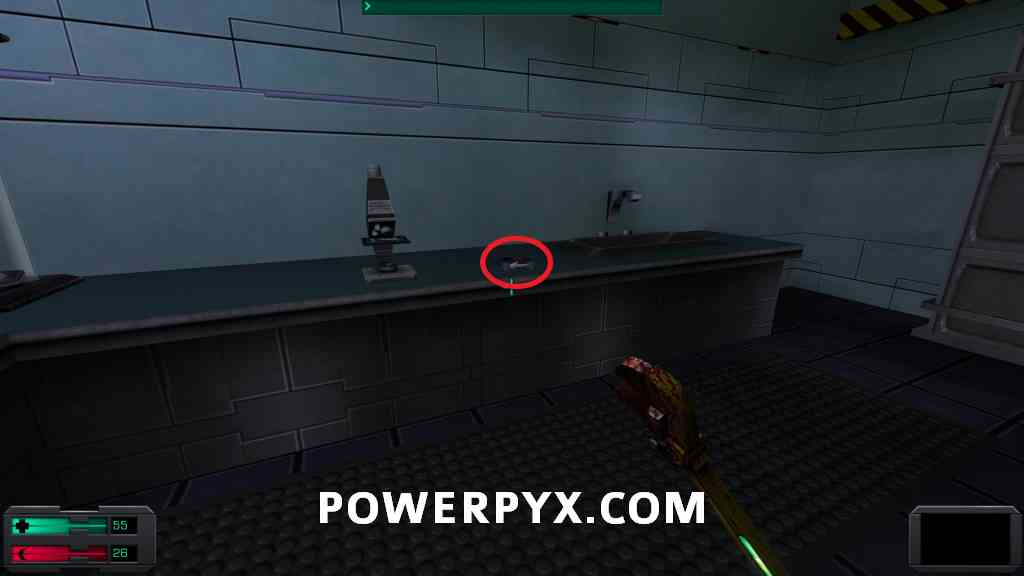 Leave the previous room and look over the gantry to spot this on a desk below, drop down and grab it.