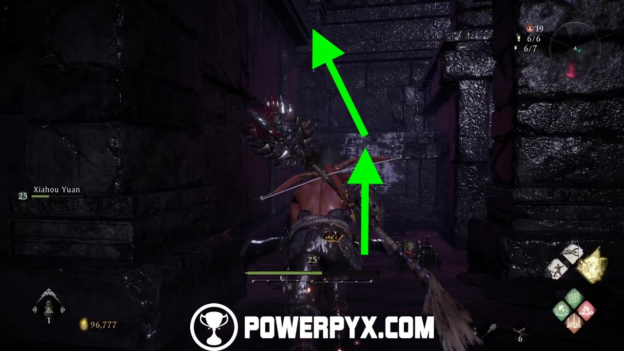 First, head into the middle room for some loot, but watch out for the Shuigui here. Then, leave this alcove and head right. Proceed to the ledge on your right, then up a second one.