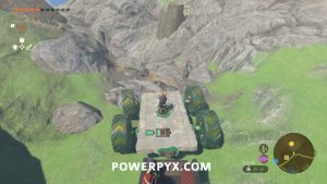 When standing in front of Mastro, look to the left to find a big stone cart with 3 green wheels. Attach the 4th wheel that fell off. Make sure the arrows on all 4 wheels are facing forward in the same direction! Also attach the Steering Stick on top, facing forward.